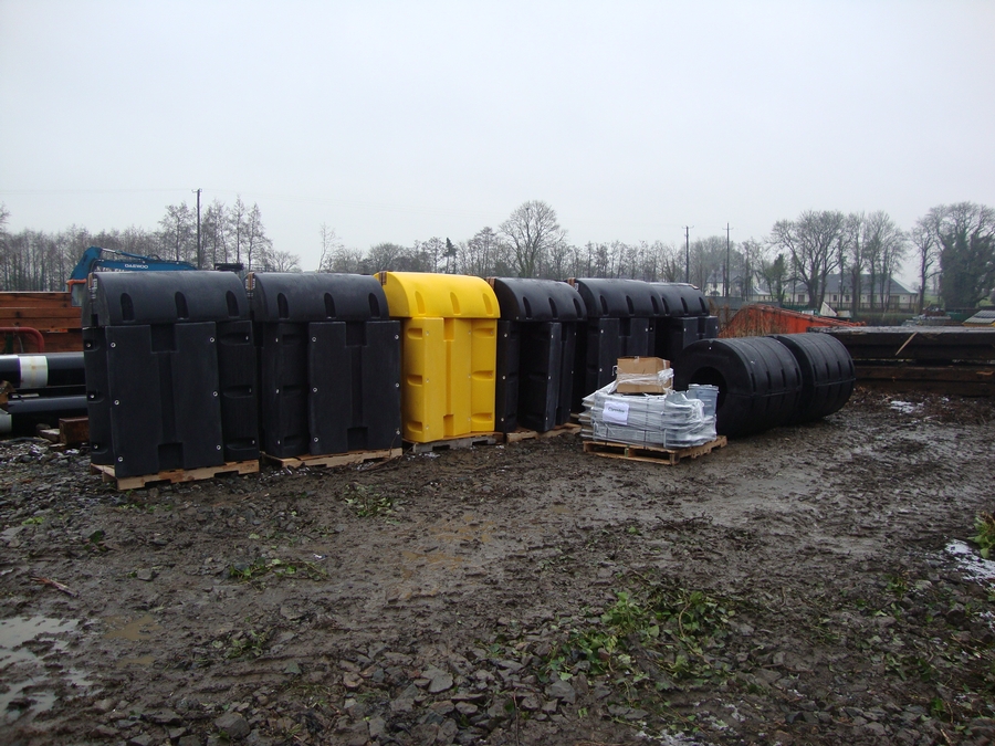 In February 2010 the booms were delivered as containerised sea freight from the USA and unloaded by Norfolk Marine Ltd at Waterways Irelands facilities along with the boom to pile anchorages that were fabricated locally in Ireland.
