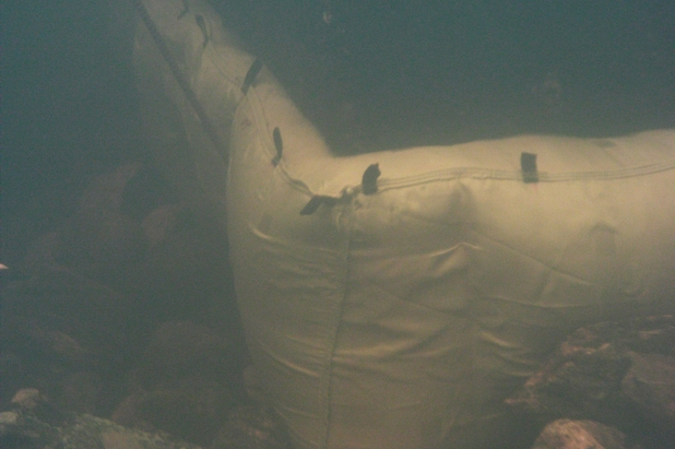 A fabric formwork mattress was fabricated and install along with a temporary support system to hold the fabric formwork in place during filling and curing of the concrete. The works were completed over two days window wile the rivers flow rate was low. The works were carried out with the minimum disturbance to the river bed and without the need to operate any plant in the river itself. Under the watchful eye of the client the concrete was pumped in to the formwork with no discernable discharge in to the water course and no effect on the fish happily swimming under and around the bridge.